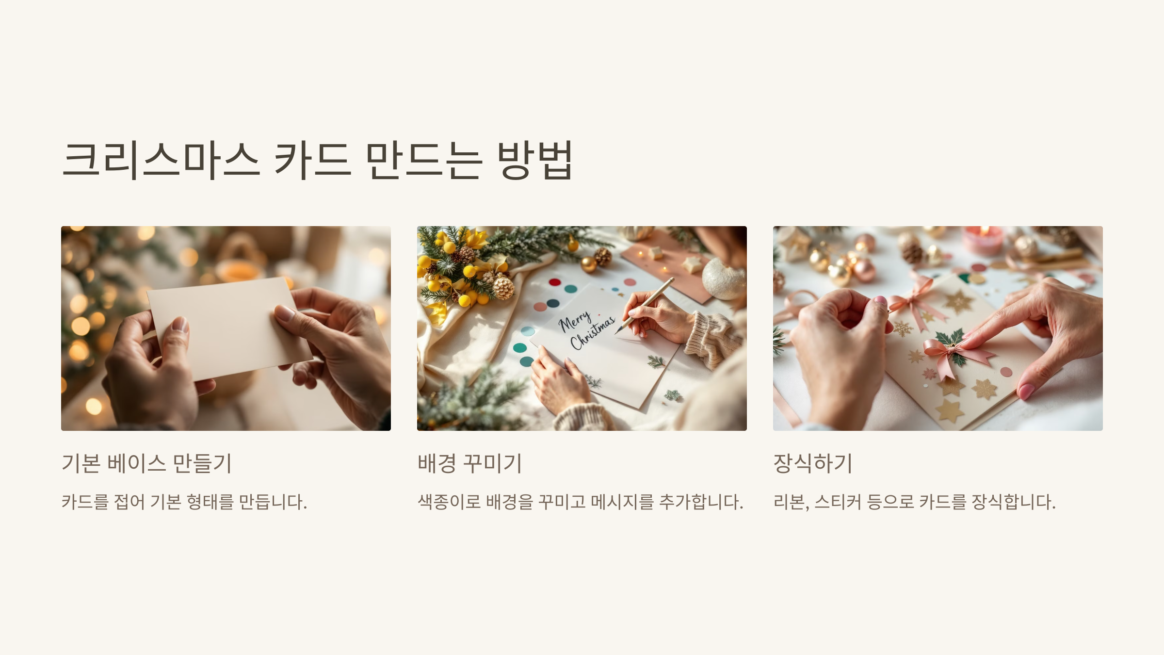 소중한 사람에게 크리스마스 카드를 직접 만들어 주는 건 어떨까요? 따라 하기 쉬운 가이드를 통해 특별한 카드로 진심을 전달해 보세요. 카드 하나로 따뜻한 마음을 전할 수 있습니다.