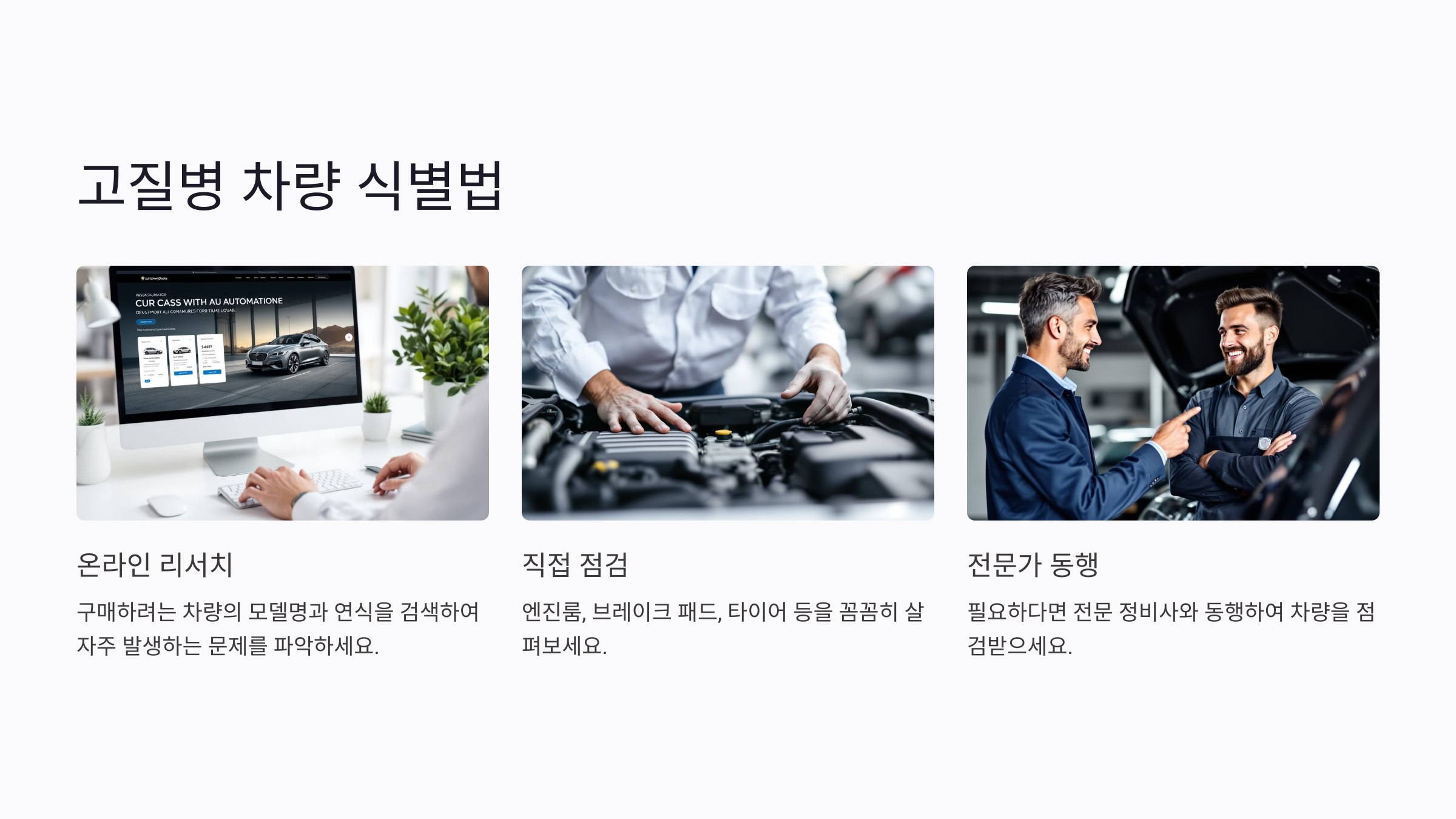 중고차 중에는 특정 모델이나 연식에서 반복적으로 나타나는 고질병 문제가 있을 수 있어요. 이런 차량을 구매하면 이후 수리 비용이 많이 들기 때문에 미리 식별하는 방법을 알아야 해요.