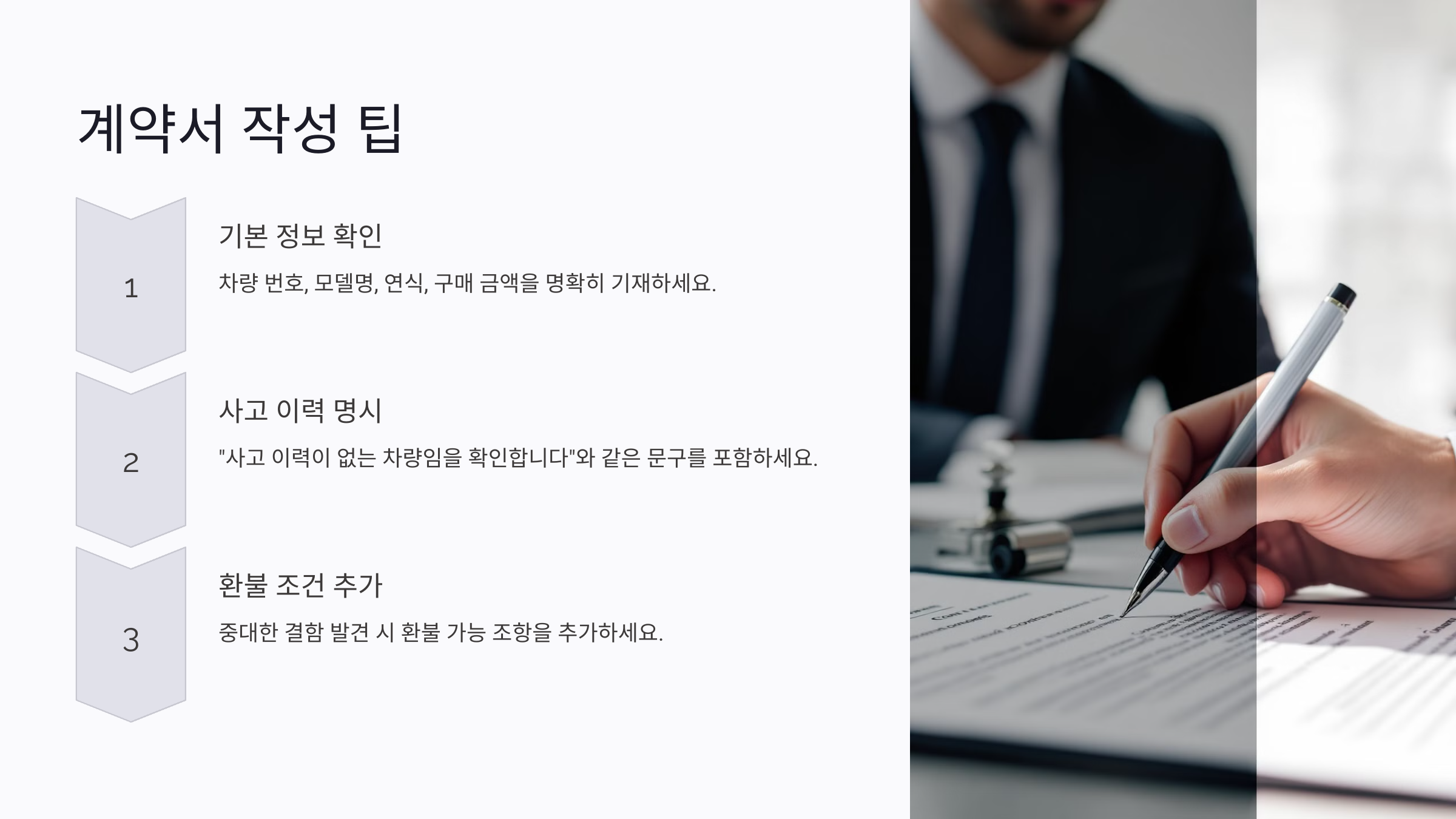 환불 조건을 계약서에 추가하는 것도 중요해요. "구매 후 일정 기간 내에 중대한 결함이 발견되면 환불이 가능합니다"와 같은 조항을 포함하면, 차량에 문제가 생겼을 때 더 안전하게 대처할 수 있어요.