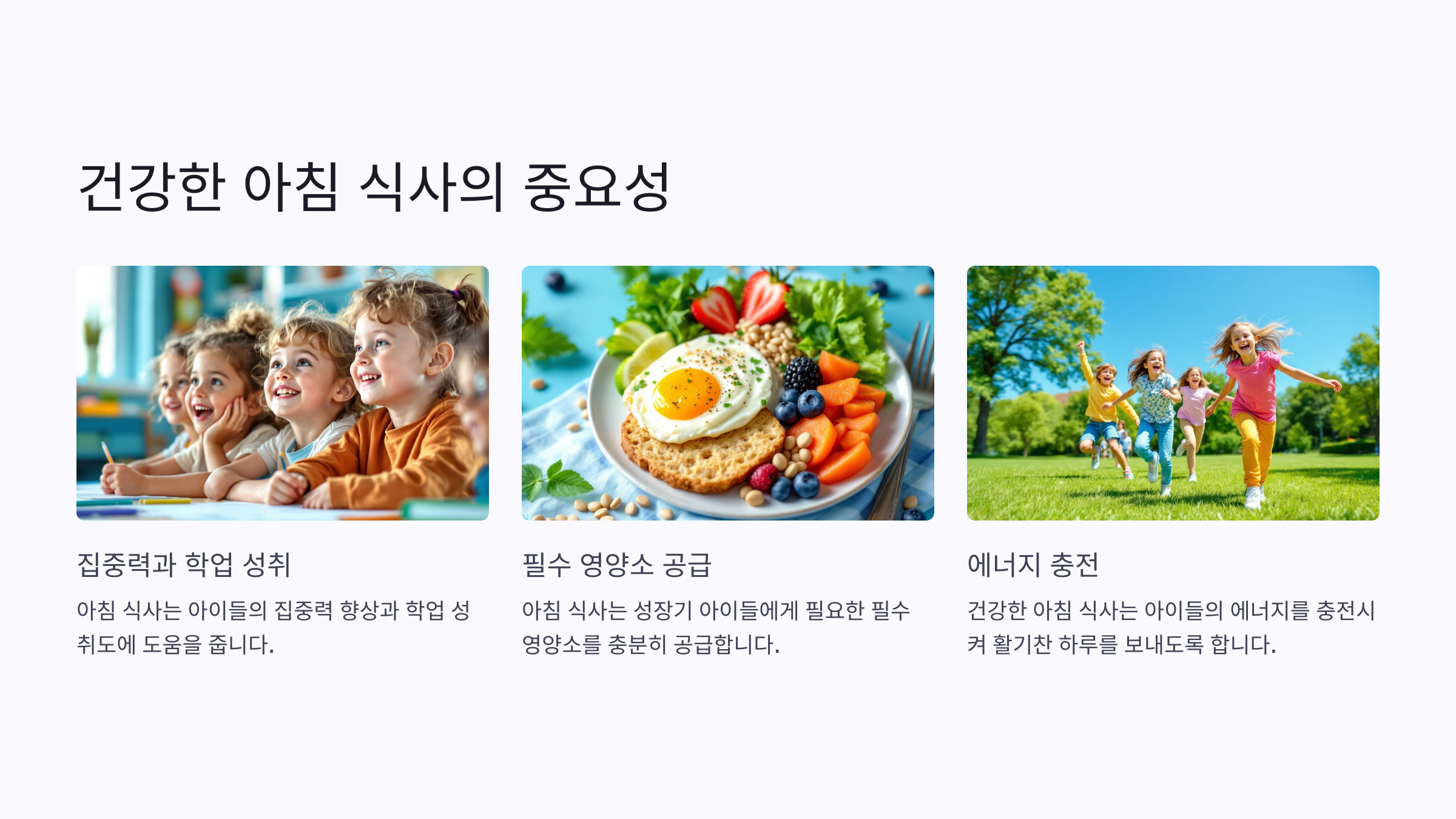 아침 식사는 아이들의 집중력과 학업 성취에 긍정적인 영향을 줍니다.
