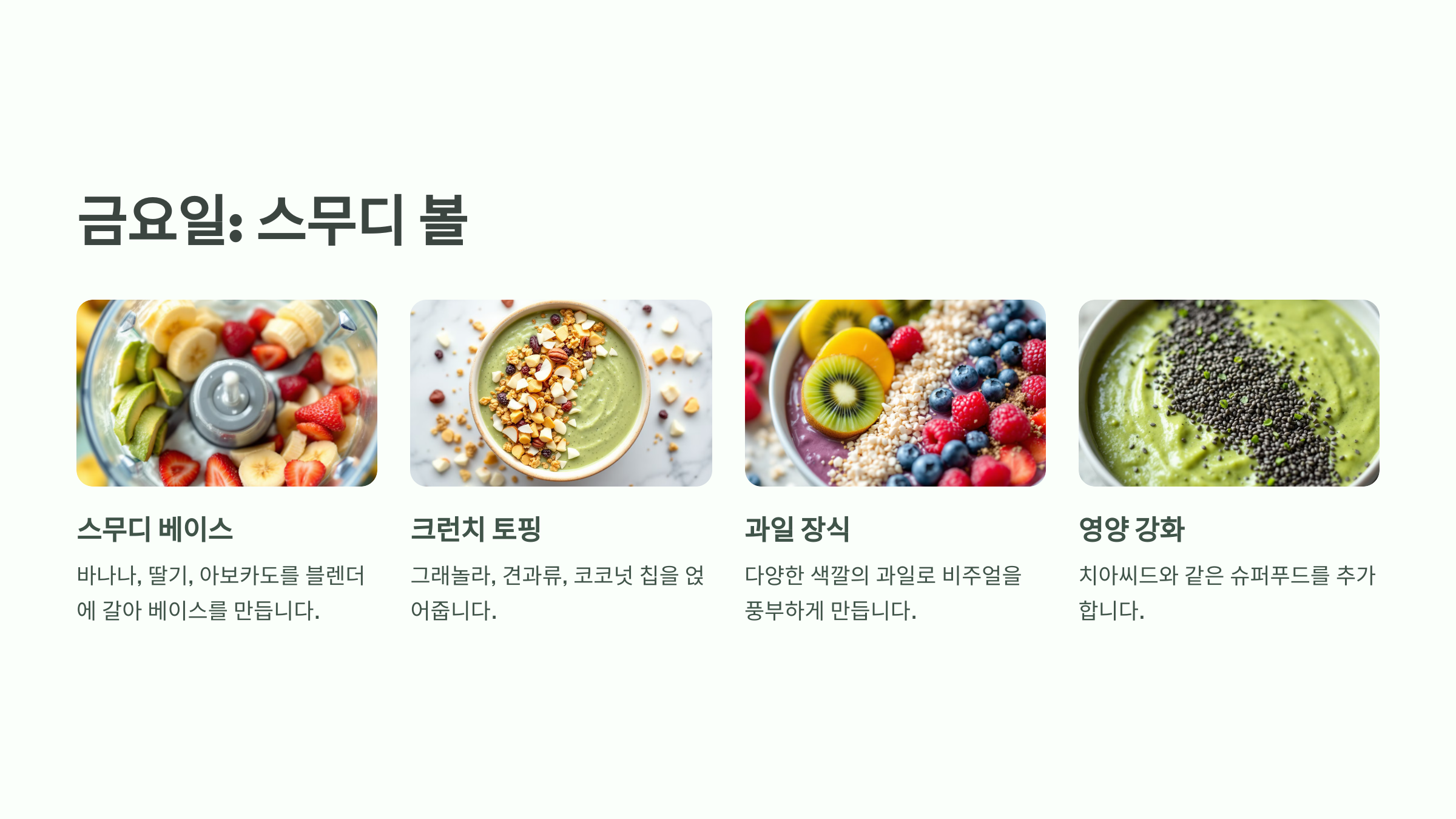A: 다양한 재료와 조합을 활용해 매일 다른 메뉴를 준비하세요. 예: 팬케이크, 스무디 볼, 오믈렛 등.