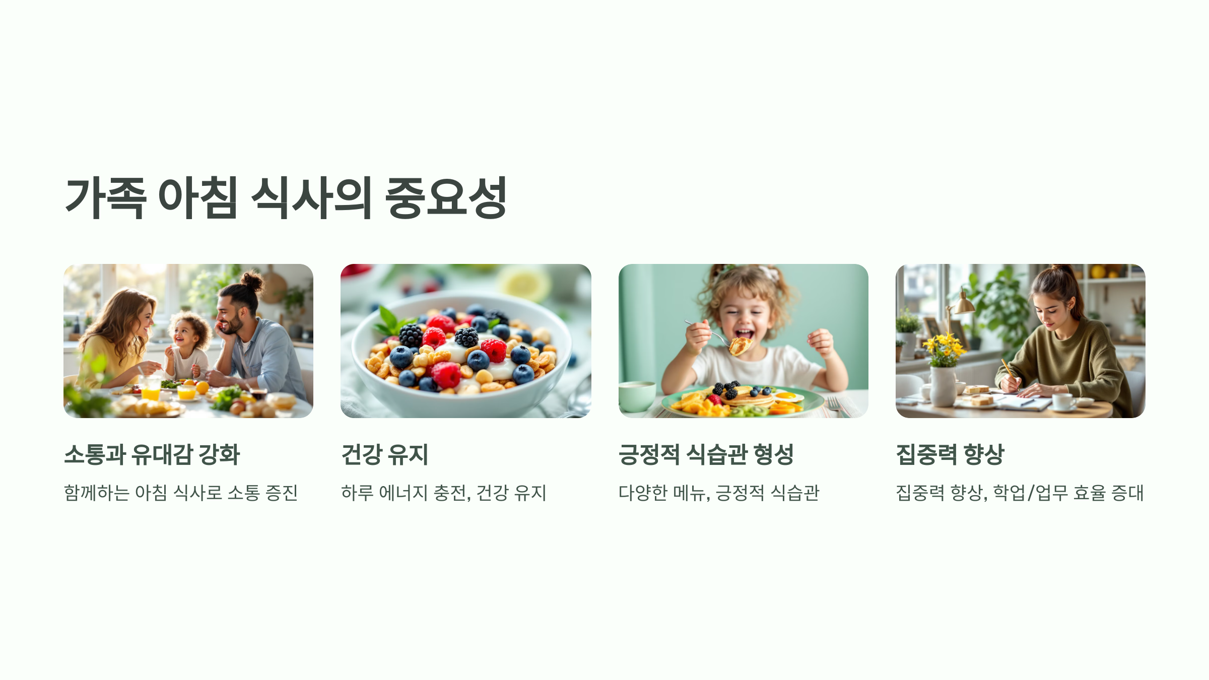 건강한 아침 식사는 학업과 업무 집중력 향상에 도움을 줍니다.
